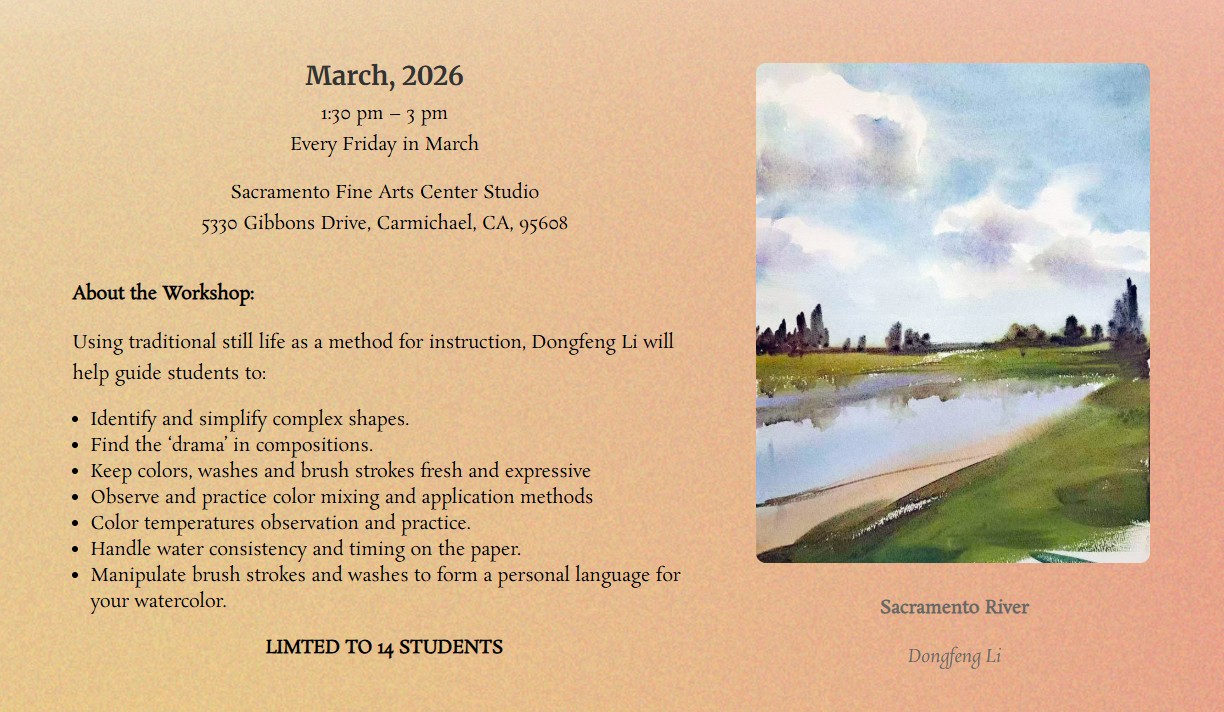 We invite you to become a member of the Watercolor Artists of Sacramento Horizons (WASH), a vibrant community dedicated to celebrating and promoting the art of watercolor. As a member, you’ll enjoy exclusive access to exhibitions, workshops, demonstrations, and networking opportunities with fellow artists who share your passion. Whether you’re a seasoned painter or just beginning your artistic journey, WASH offers inspiration, support, and a chance to grow both creatively and professionally. Join us and be part of a dynamic organization that fosters artistic excellence and connection within the Sacramento Fine Art Center (SFAC) community.